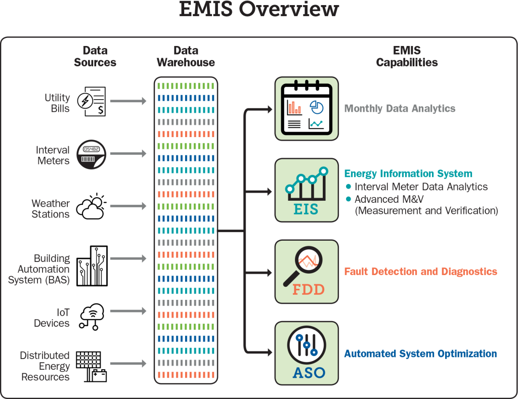 Organizations that participated in the Smart Energy Analytics Campaign installed some form of energy management and information system (EMIS) which includes: monthly utility data analytics, energy information systems (EIS), fault detection and diagnostics (FDD), or automated system optimization (ASO).