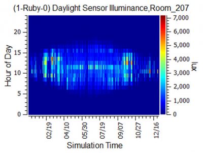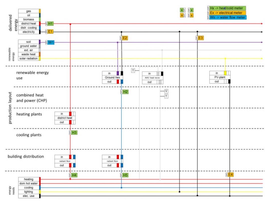 The energy concept of the building included construction with very low U-value, triple glazed windows and design to use natural lighting and natural ventilation. Solar gains meet most heating demands through the south-facing façade. When additional heating is required, this is delivered through a communal district heating network. Cooling demands are met by a ground-source heat pump placed under the ZUB basement. As the building is air-tight, an 80% mechanical ventilation with heat recovery system is used.